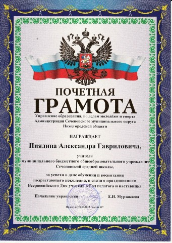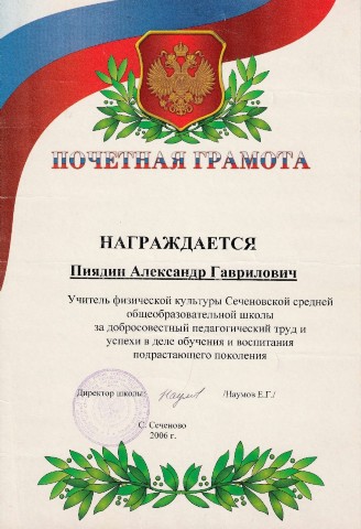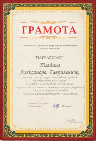 Грамота районного управления образования, 2024г.Признанный лучшим игроком в кубке главы МСУ Сеченовского муниципального круга по "Русской лапте" |