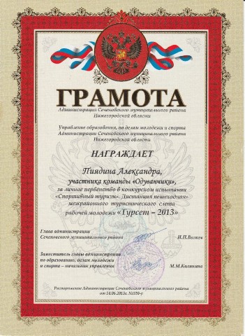 Диплом районного управления образования за личное первенство в конкурсном испытании «Спортивный туризм», 2013г. |