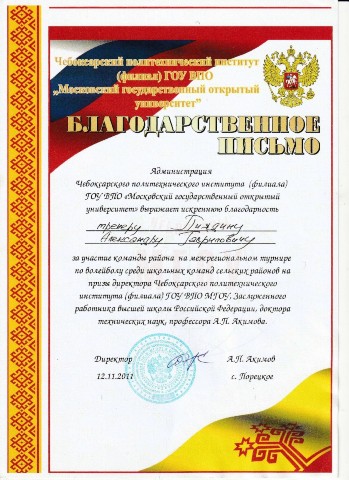 Благодарственное письмо администрации Чебоксарского политехнического института, 2011г. |