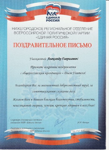 Поздравительное письмо от Нижегородского регионального отделения всероссийской политической партии "Единая Россия" |