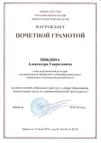 Почетная грамота Министерства образования и науки Нижегородской области, 2024г. |