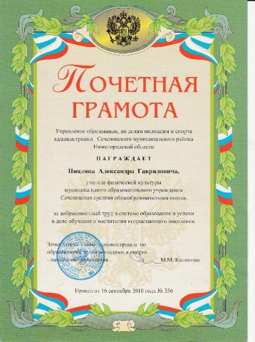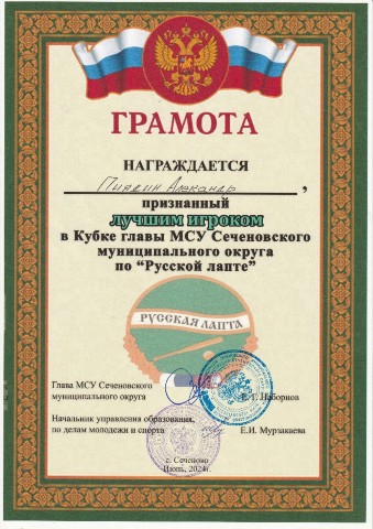 Грамота районного управления образования, 2024г.Признанный лучшим игроком в кубке главы МСУ Сеченовского муниципального круга по "Русской лапте" |
